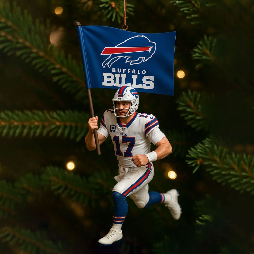 🏈🌲Lead the charge into the holiday season with this powerful Buffalo Bills ornament featuring quarterback Josh Allen in full stride, proudly carrying the team flag!