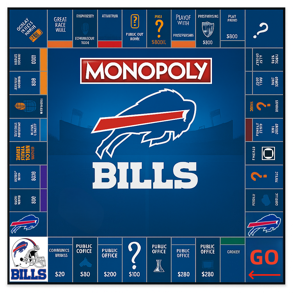 - 🏟️ Exclusive Game Board – Dominated by Bills blue, covered with team logos, stadium backdrops, and iconic elements.