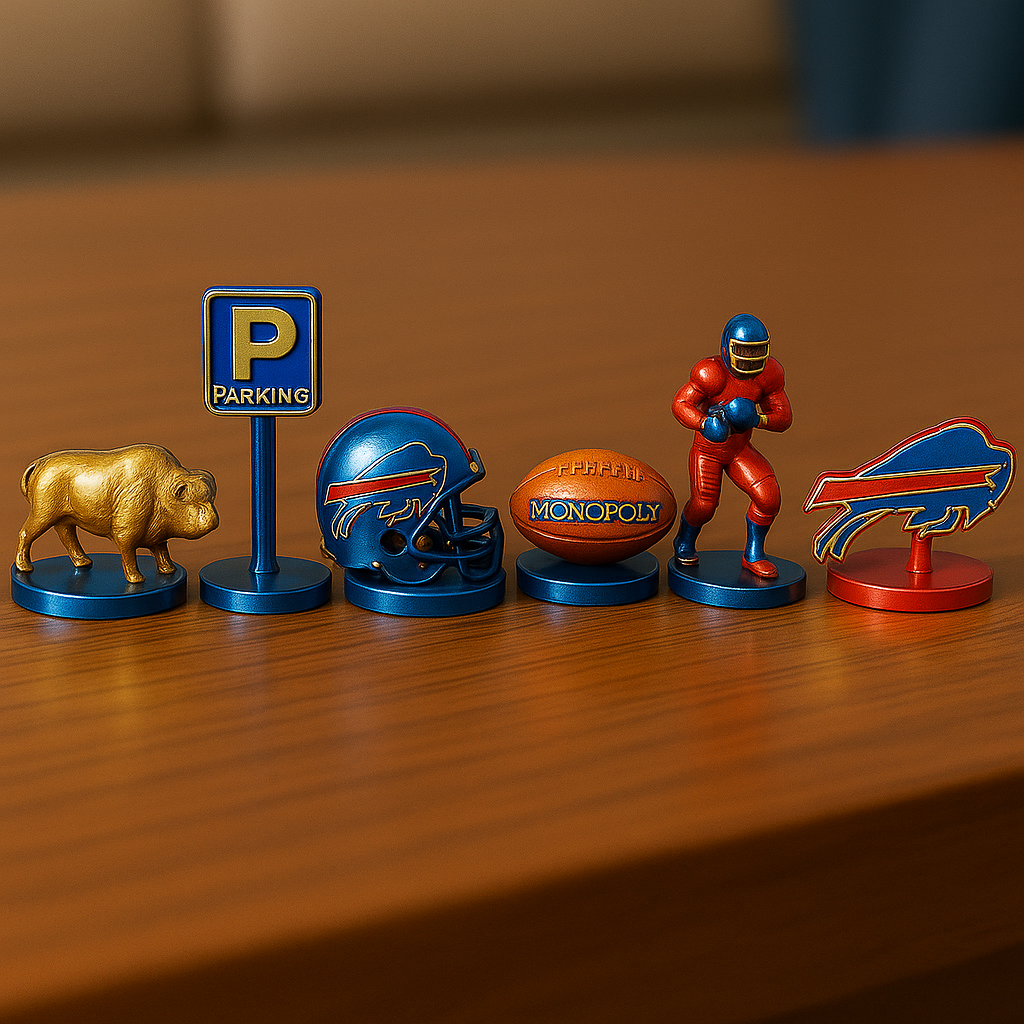 - 🏆 Premium Metal Tokens – Golden buffalo, parking sign, team helmet, football, quarterback figure, and 3D team logo — each crafted with collectible-quality detail.