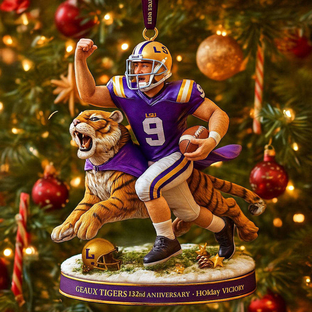 🏈This ornament features an LSU quarterback in classic purple and gold, riding the mighty tiger — a symbol of courage, strength, and passion. Hang it proudly on your Christmas tree and relive the electrifying moments that define LSU tradition.