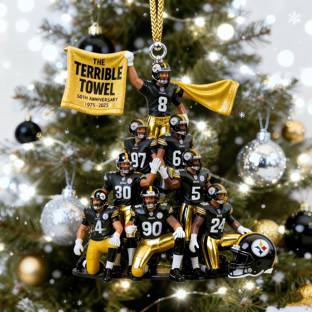 🎖️ Featuring the team's dynamic squad (dressed in sleek black-and-gold) alongside the 50th anniversary Terrible Towel and iconic helmet, this ornament merges Steel City grit with championship legacy. From the bold "1975–2025" detailing to the golden accents, every inch honors the decades of passion, camaraderie, and gridiron greatness that define Steelers fandom.