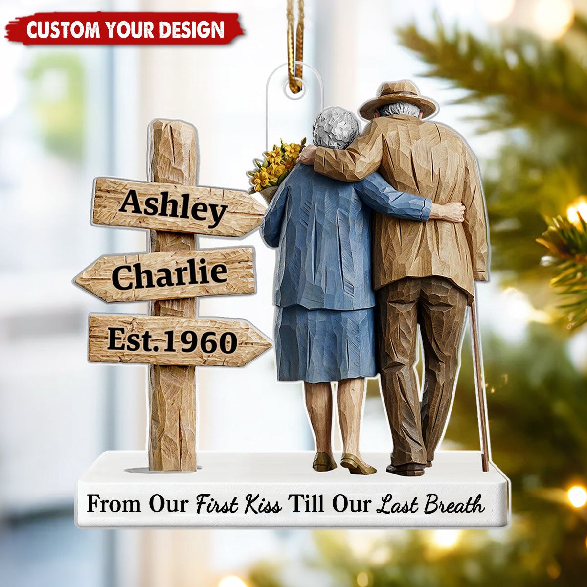 Honor a lifetime of love with this Old Couple Sign Post - Personalized Acrylic Ornament. Designed to capture attention with its tender depiction of an elderly couple walking arm in arm, it beautifully symbolizes devotion, companionship, and a love that has stood the test of time. Build interest with richly detailed faux-wood textures on both the couple and the signpost, all professionally printed to mimic carved craftsmanship while remaining lightweight and durable. Create desire through meaningful personalization—add names, an established year, or a heartfelt message to turn this touching scene into a treasured keepsake. Encourage action by gifting an ornament that celebrates a relationship filled with shared memories and unwavering commitment.