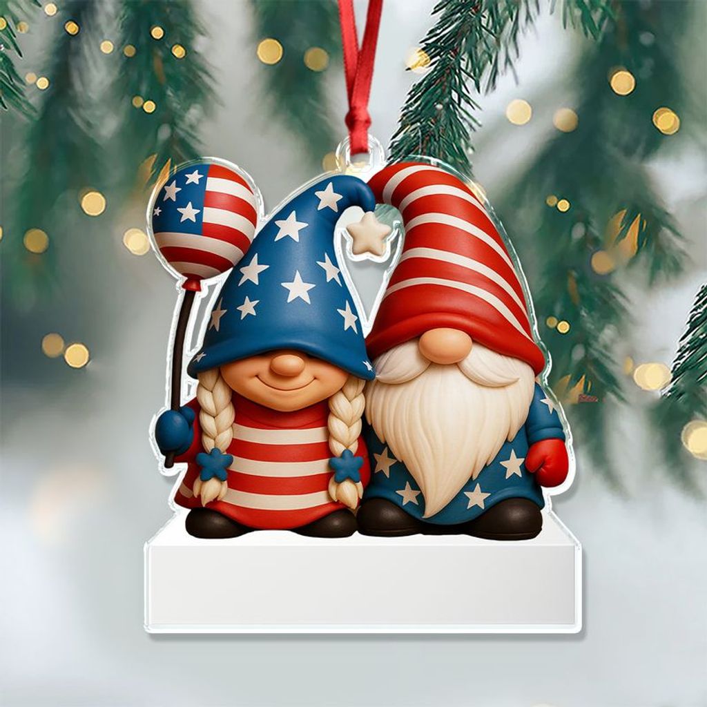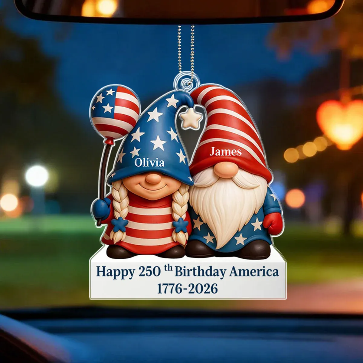 Personalize it with two names (up to 15 characters each) on the gnomes' hats and choose "Happy 250th Birthday" or your own custom quote. This heartfelt keepsake symbolizes love, patriotism, and the spirit of 1776-2026 celebrations—ideal as a romantic gift for couples, a rearview mirror accessory, or a unique patriotic car decor.
