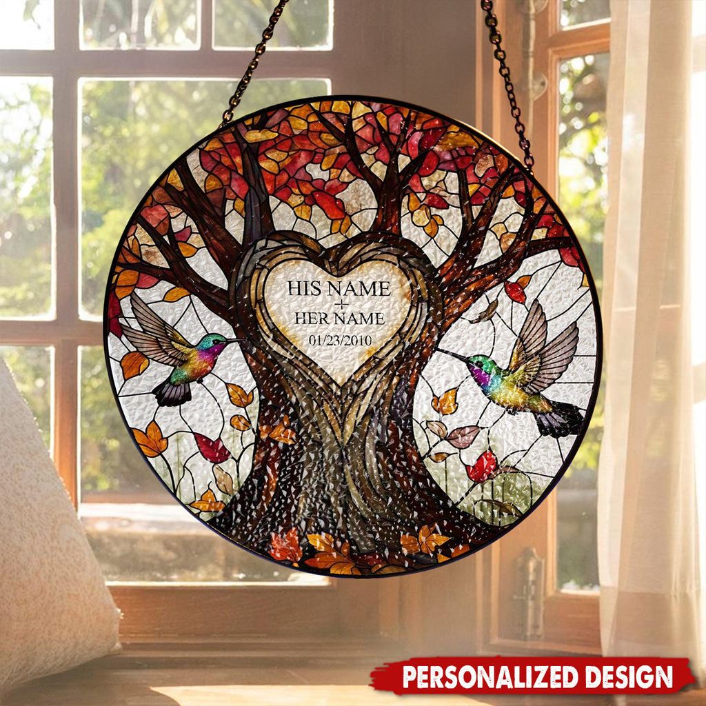 Personalized Tree of Life Stained Glass Suncatcher with Hummingbirds - Custom Couple Names & Date Anniversary Gift, Wedding Keepsake Window Hanging